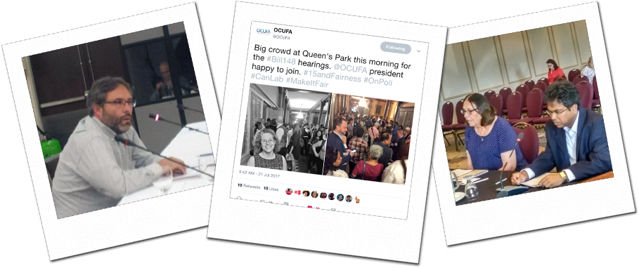 The government is currently considering changes to employment and labour law that could bring more fairness to workplaces across the province. More than ten faculty associations presented at the recent hearings on Bill 148, Fair Workplaces, Better Jobs Act about how the bill can deliver fairness for contract faculty, including equal pay for equal work, fair scheduling, and more secure and stable jobs. Faculty also addressed the importance of the right to join a union and better options for consolidating bargaining units.